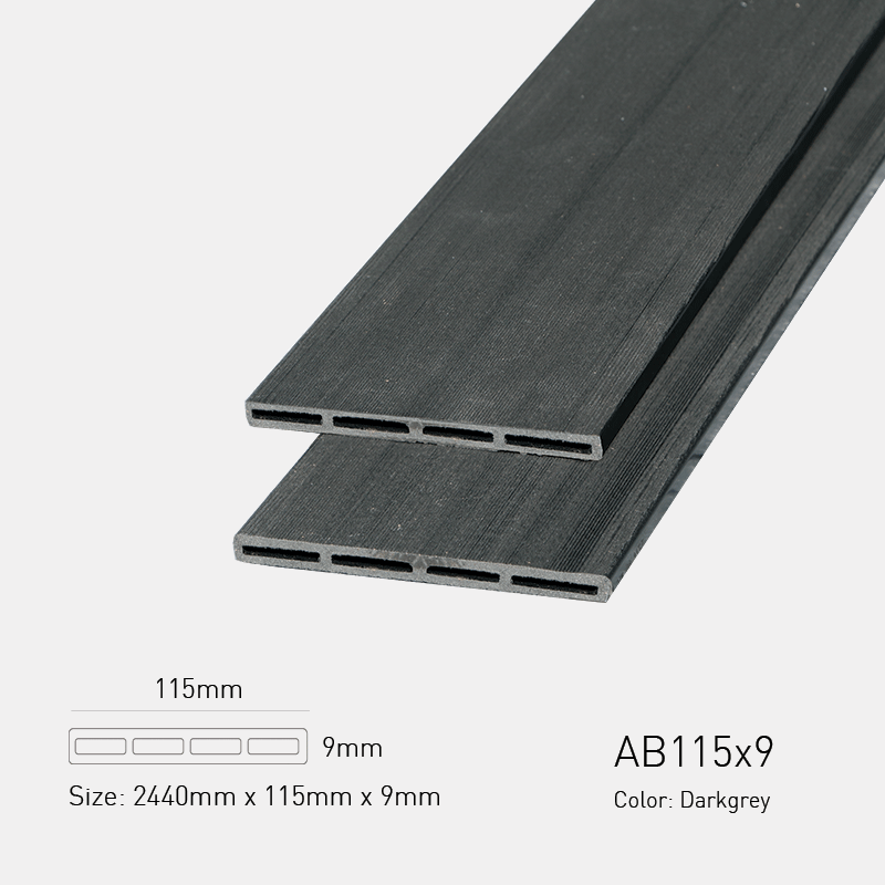 AWood AB115x9 Darkgrey. Bảo hành 5 năm ngoài trời Cấu tạo nhựa Pe nguyên sinh + gỗ, màu xám than nguyên chất không cần sơn hay phủ lớp bảo vệ Chuyên dụng ngoài trời chịu nắng mưa, có UV chống nắng 100% không phai màu, Ứng dụng trang trí ngoài trời: lam che nắng, ốp tường, ốp trần, vách trang trí, hàng rào và cổng Công trình ứng dụng sàn gỗ Awood AB115x9-darkgrey: