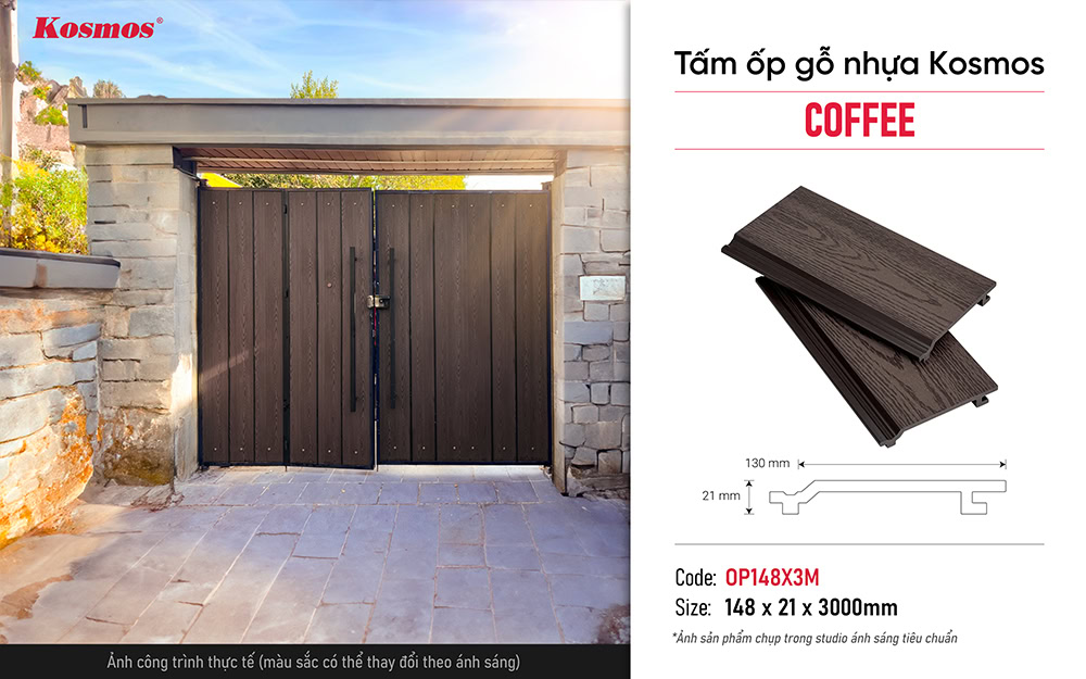 Tấm ốp 1 lớp Kosmos màu cà phê vân gỗ, chống UV/bền màu, chịu lực tốt. Ứng dụng ốp tường ngoài trời, trang trí ngoại thất. Dễ vệ sinh, thân thiện.
